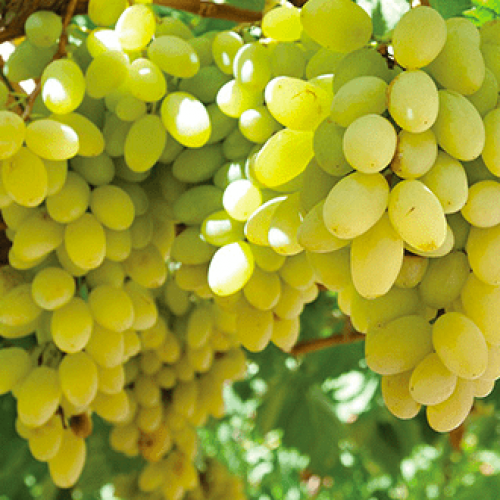 Зърна: Много едри, продълговати, 9–11 г, жълто-зелени до кехлибарени при пълна зрялост, без семена. Месото е хрупкаво и сладко с лека киселинност.