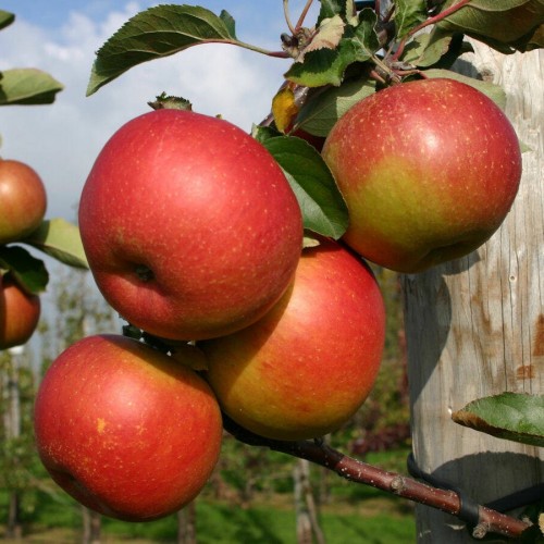Плодове: Ябълките са средно големи до големи, с кръгла или леко овална форма. Кожицата им е гладка и восъчна, с интензивен червен цвят. Плътта е кремава, сочна и с фина текстура.
