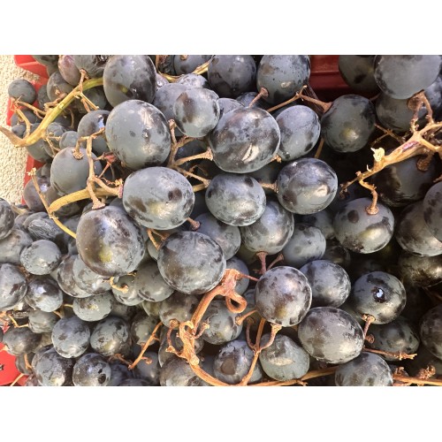 - Грозд и зърно: Гроздовете са големи (средно 300-500 г, понякога до 800 г), конични и рехави. Зърната са много едри, овални до продълговати, с тъмносиня до виолетово-черна дебела кожица, покрита с обилен восъчен налеп.